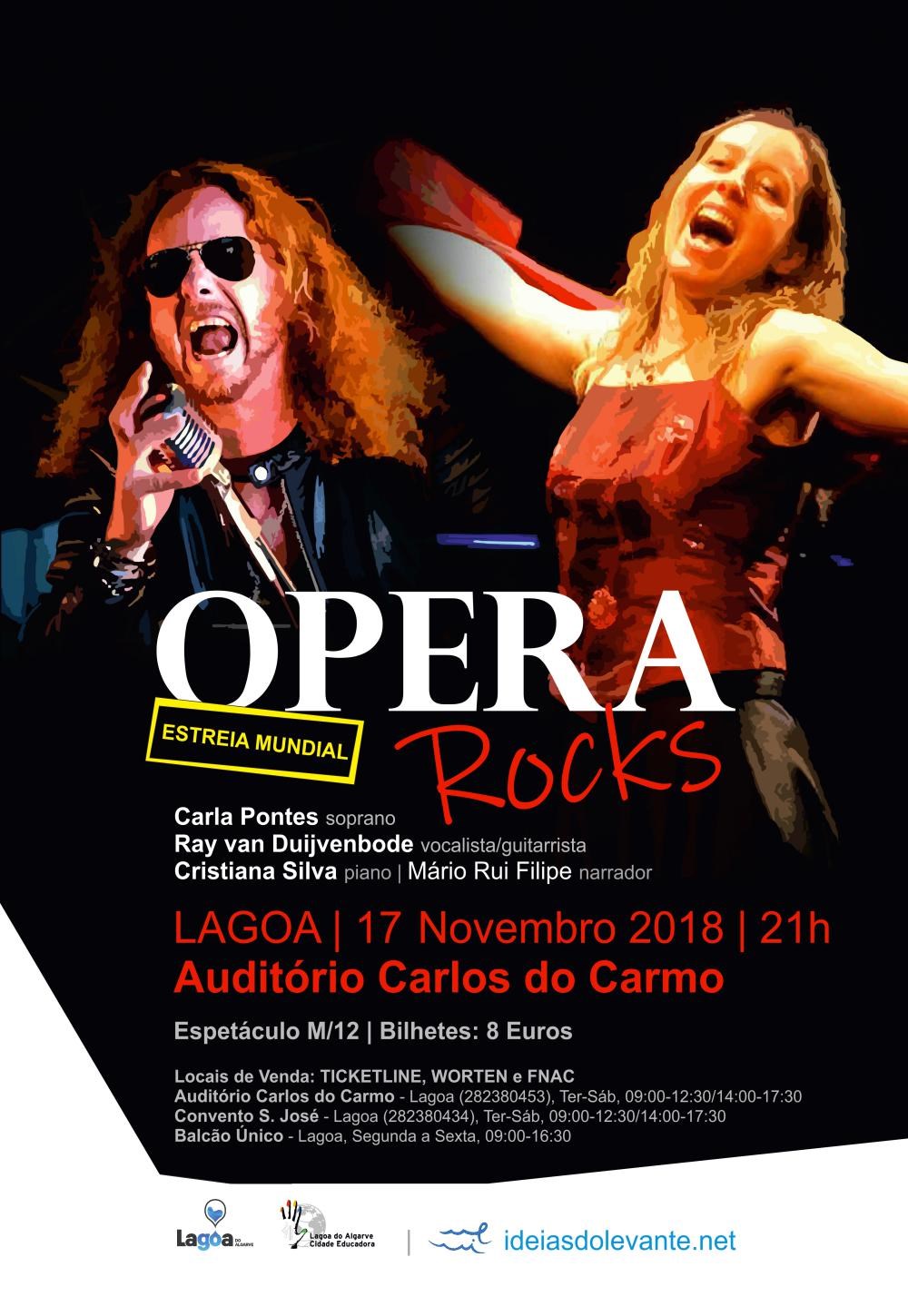 A Ideias do Levante - Associação Cultural de Lagoa (Algarve), em parceria com o Município de Lagoa (Algarve), irá estrear o seu mais recente projecto musical intitulado “Opera Rocks”, no dia 17 de Novembro de 2018, no Auditório Carlos do Carmo (Lagoa), às 21:00, contando com a interpretação de Carla Pontes (soprano), Ray van Duijvenbode (voz e guitarra) e Cristiana Silva (piano), e com a narração de Mário Rui Filipe (encenador e actor).